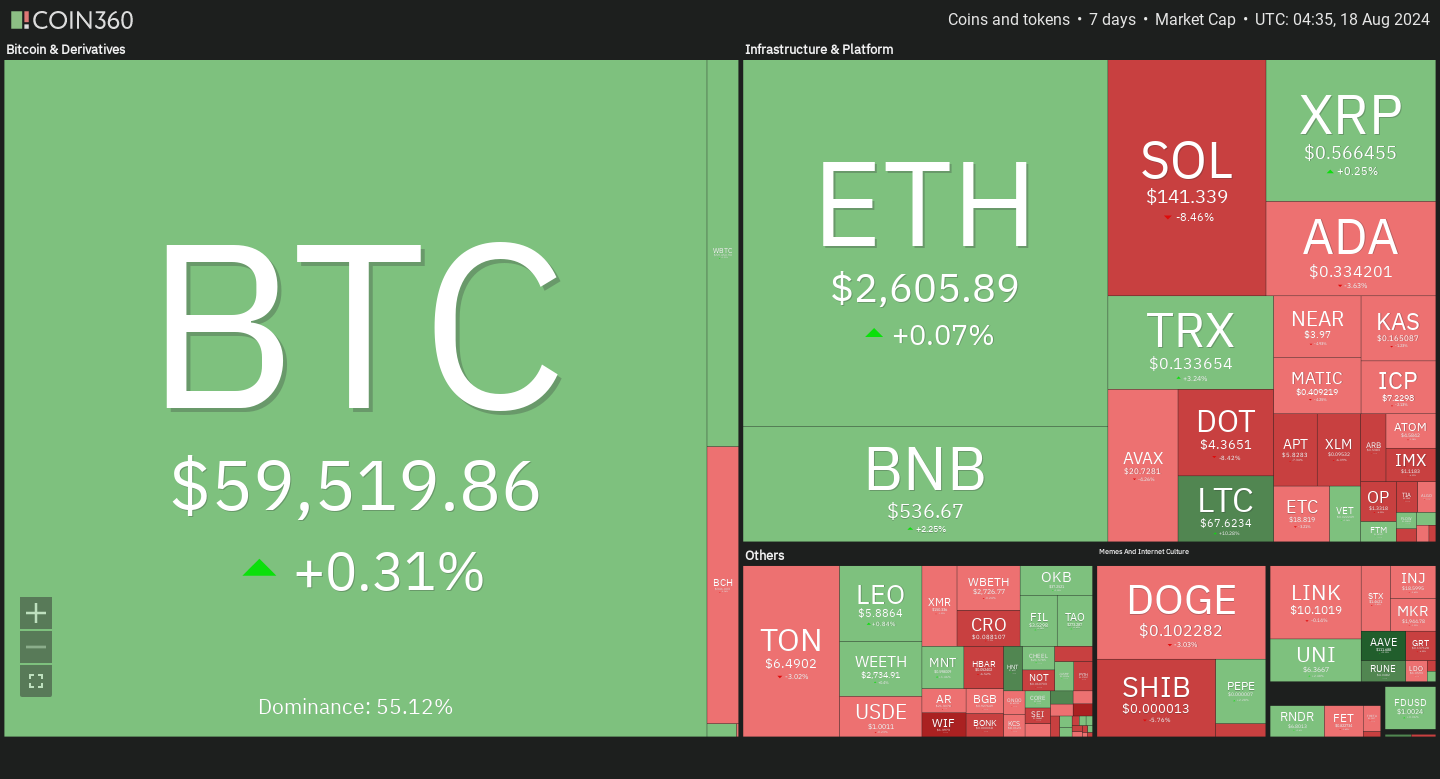 🔥🗺️ 7-day heatmap below, showing the current share of the market for the top cryptocurrencies, and their change in price over the last week.