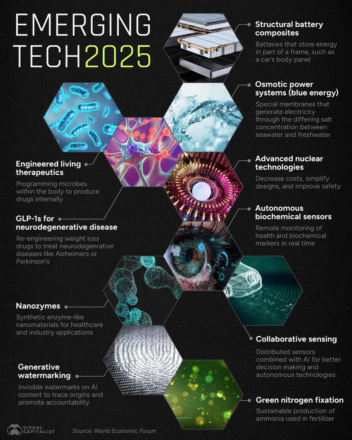 In a world accelerating toward exponential technological change, the World Economic Forum's Top 10 Emerging Technologies of 2025 offers a timely and authoritative lens into what’s coming next. From self-healing materials and embedded batteries to generative AI watermarking and living therapeutics, this year’s list doesn’t just track innovation — it captures the tectonic shifts redefining how we live, work, power, and heal. Whether you're a policymaker, investor, or technologist, this report is essential reading to stay ahead of the curve.