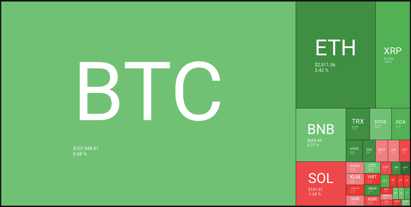 🔥🗺️Heat map shows the 7 day change in price (red down, green up) and block size is market cap.