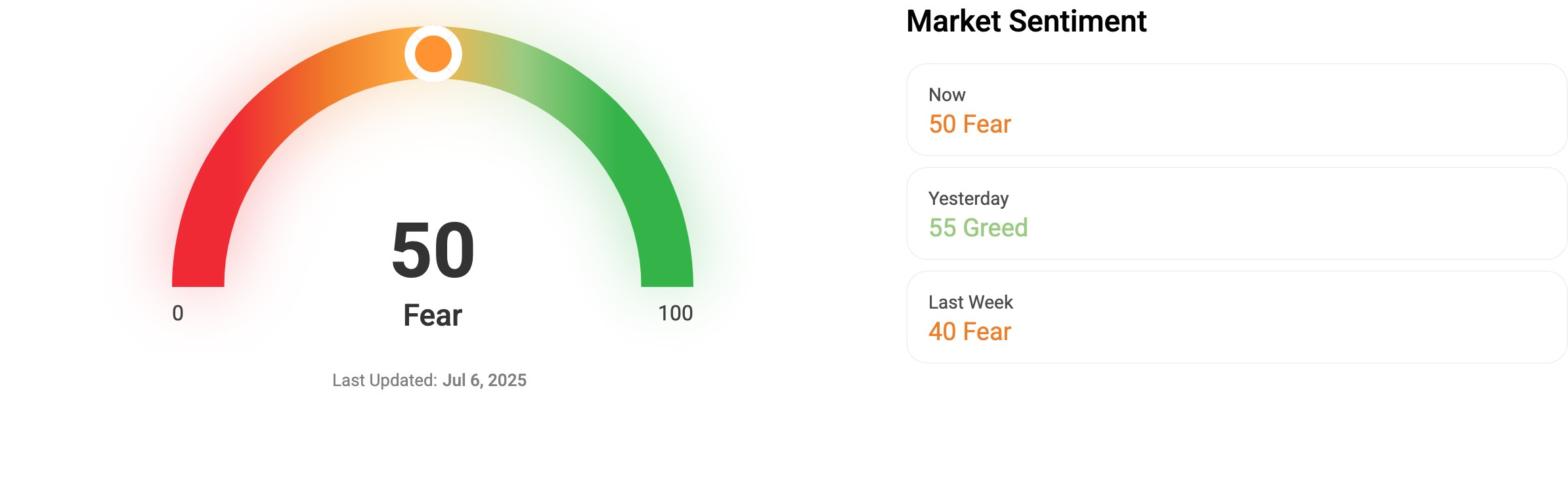 🎭 Crypto Fear and Greed Index is an insight into the underlying psychological forces that drives the market’s volatility. Sentiment reveals itself across various channels—from social media activity to Google search trends—and when analysed alongside market data, these signals provide meaningful insight into the prevailing investment climate. The Fear & Greed Index aggregates these inputs, assigning weighted value to each, and distils them into a single, unified score.