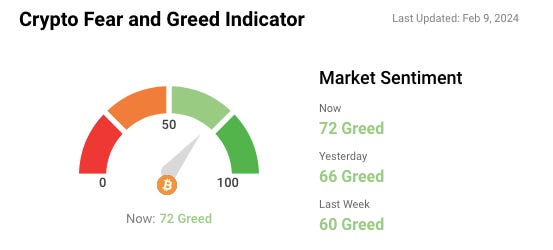 🎭 Crypto Fear and Greed Index is based on volatility, social media sentiments, surveys, market momentum, and a few other bits and pieces. Back firmly in the greed zone.