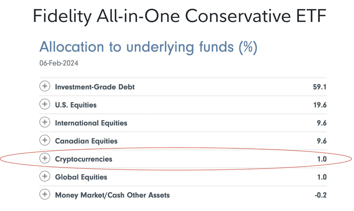 1️⃣2️⃣3️⃣ Fidelity has a 1-3% bitcoin allocation in their "All-in-One" asset allocation funds in Canada, using spot bitcoin ETFs. The "Conservative" version is posted below. They have 3.1% allocation in the aggressive portfolio and 2.5% in the balanced portfolio. What if this 1,2,3 rule becomes the normal for many large funds?