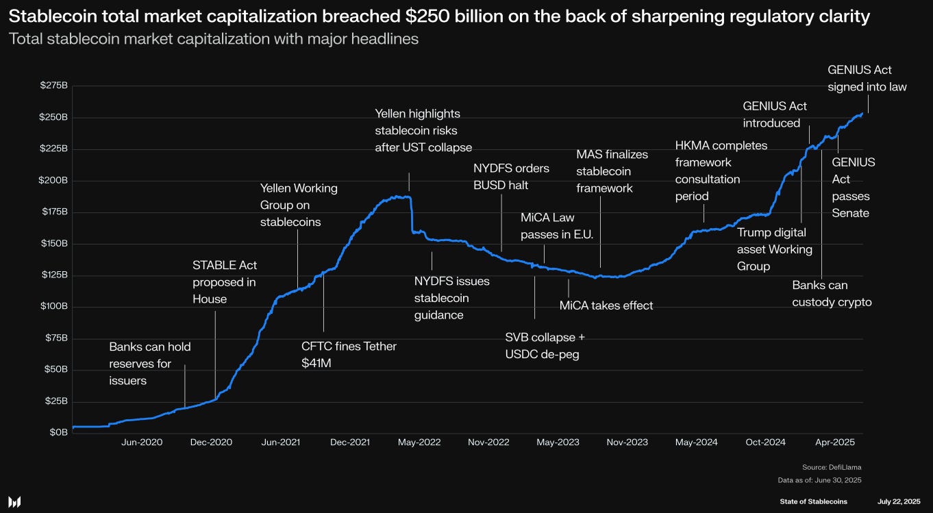 $250 billion market-cap milestone on clearer rules. Total outstanding stablecoins punched through $250 billion, right as bills such as the GENIUS Act and MiCA moved from drafts to law, ending a two-year drawdown and unleashing a wave of new issuers.