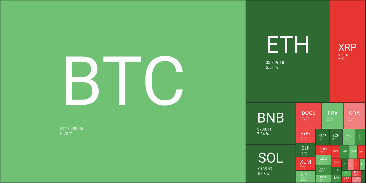 🔥🗺️Heat map shows the 7 day change in price (red down, green up) and block size is market cap.