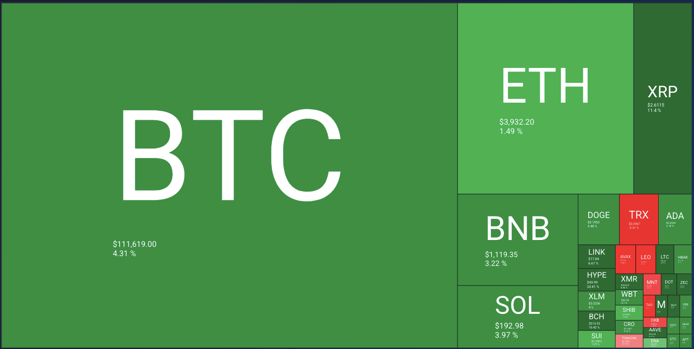 🔥🗺️Heat map shows the 7 day change in price (red down, green up) and block size is market cap.