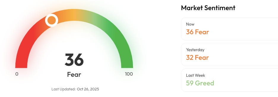 🎭 Crypto Fear and Greed Index is an insight into the underlying psychological forces that drive the market’s volatility. Sentiment reveals itself across various channels—from social media activity to Google search trends—and when analysed alongside market data, these signals provide meaningful insight into the prevailing investment climate. The Fear & Greed Index aggregates these inputs, assigning weighted value to each, and distils them into a single, unified score.